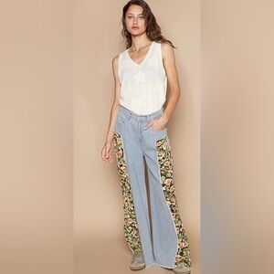 Uniquely fabulous on-trend striped blue denim wide leg pants feature outseam detail, inside elastic back band, fabulous floral patch side inserts, raw edges and vintage washing.