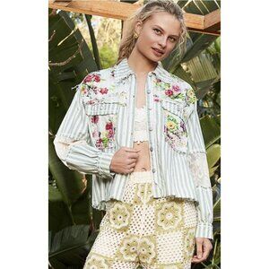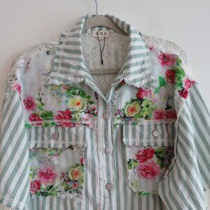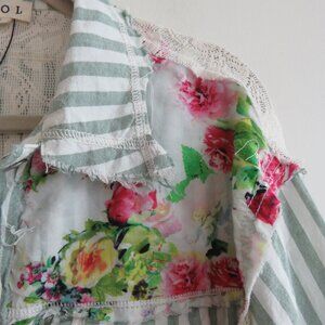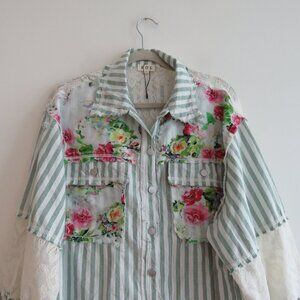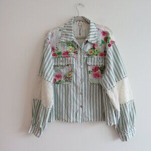 POL Striped Floral Lace Patchwork Boho Shacket Shirt Hobo Shabby Chic - Size L