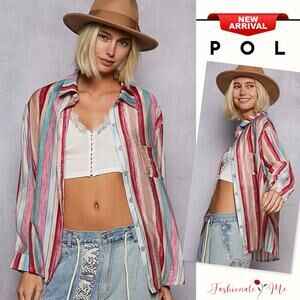 POL Striped Pattern Long Sleeves Chest Pocket Button Down Oversized Shirt | Pink