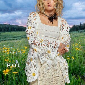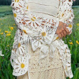 POL Sunny Yellow Daisies Open Knit Crochet Lace Cardigan Sweater Jacket Top