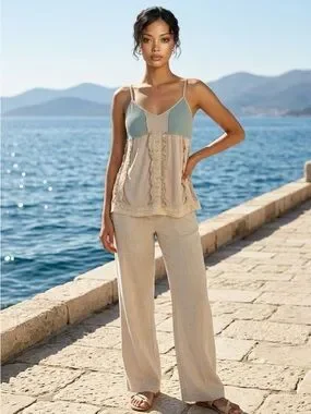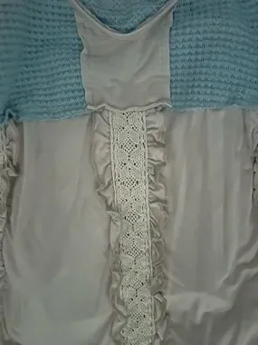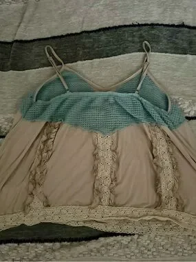 Cream POL Tank Top featuring light blue crochet neckline. Delicate lace and spaghetti straps. Breezy, feminine style.