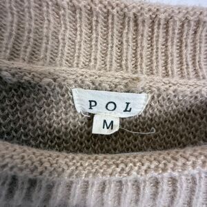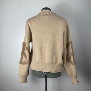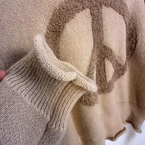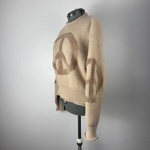 Cozy, soft and oversized POL sweater featuring a bold peace sign graphic on the front and sleeves. The peace sign is made from a soft, teddy bear-like textured yarn that adds dimension and warmth. Knit in neutral beige and taupe tones with a relaxed drop-shoulder fit. Ribbed, rolled edges hem, cuffs and neckline.