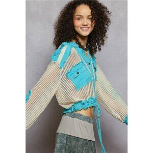 POL Texture Woven Button Down Hooded Shirt with Drawstring Hem