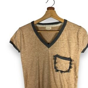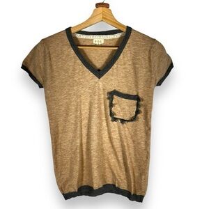 POL V Neck Pocket Short Sleeve Contrast Trim Sweater, Peach/Grey, Size Small