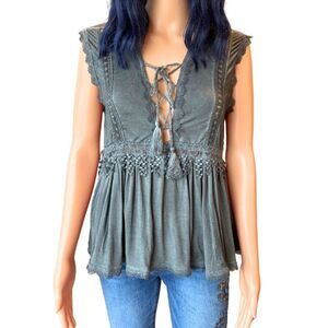 POL Washed Gray Boho Lace Up Top Size Small NEW