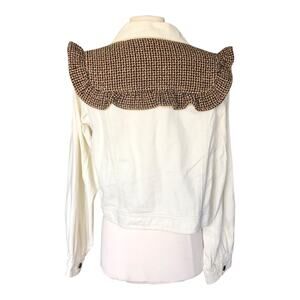 pol jacket, pol denim jacket, white denim jacket, ruffle collar jacket, tweed trim jacket, frayed hem jacket, button front jacket, boho denim jacket, shabby chic jacket, vintage inspired jacket, lightweight denim jacket, casual white jacket, womens small jacket, spring summer layering, festival outfit, edgy chic jacket, denim blazer style, structured denim, collared denim jacket, textured denim jacket