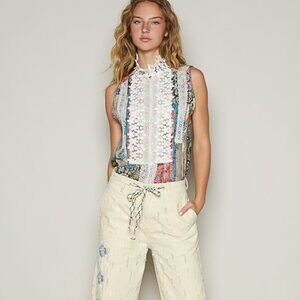 A halter-style patchwork top with delicate floral appliqué, lace detailing, and vintage-inspired color blocking. Wildflower Collage blends sweet femininity with eclectic charm — soft and flirty,