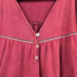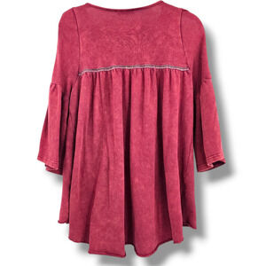 POL Women's Boho Mineral Wash Cold Shoulder V Neck 3/4 Sleeve Top Red Small