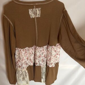 Embrace a unique style with the POL Women's Brown Floral Patchwork Top. This top features a charming brown base with floral and lace accents, perfect for adding a touch of elegance to your wardrobe.