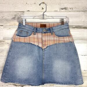 POL womens medium mini skirt plaid pink blue denim distressed boho chic boutique style trendy mixed fabric Y2K inspired casual cute skirt summer spring festival outfit soft woven denim skirt hipster grunge cottagecore playful mini skirt POL clothing