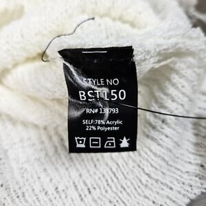 This POL sweater is designed for women in size Medium, featuring a turtleneck and long sleeves. The open-knit style gives it a unique look, with a distressed "thrashed" theme adding a touch of edginess. The sweater is white in color and made of polyester and acrylic materials, ideal for regular wear. Perfect for adding some texture and style to your outfit, this pullover sweater is a versatile piece.