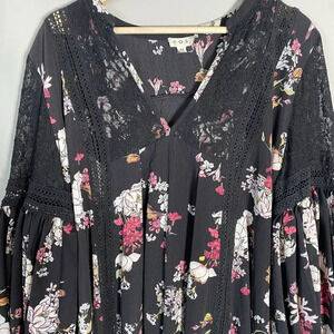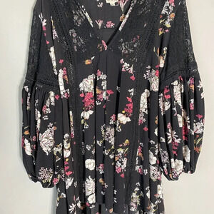 POL Women's Size Medium Floral Lace Details Boho Balloon Sleeve Black Mini Dress