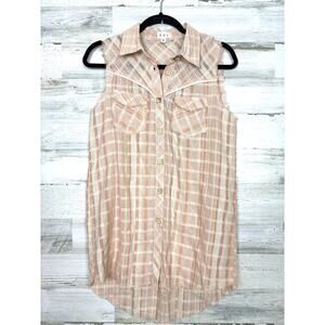 POL Women’s Small Peach White Plaid Sleeveless Boho Western Blouse Top NWT
