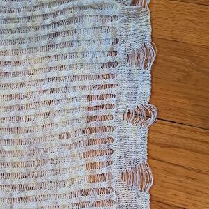 V-neck sweater by POL. Yellow and tan with intricate loose knit pattern.
