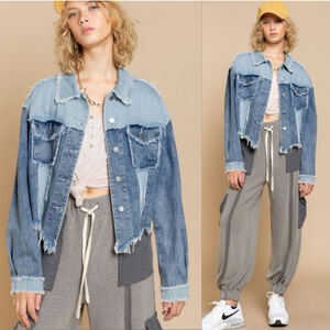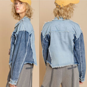 Classic denim jacket with some twists! Long sleeves. Collared. Button close. Patch flap chest pockets. Frayed edges throughout. Dark and light denim colorblock pattern. Straight hem with unfinished raw hems.