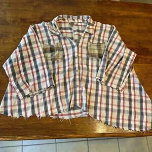 POL oversized flannel frayed edge, cream, red, navy with brown accent pockets. Size small but could fit up to xl depending on length and how oversized you want it