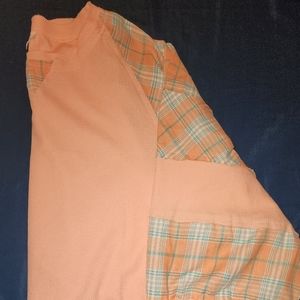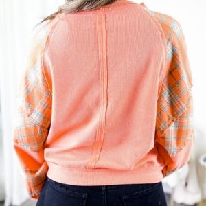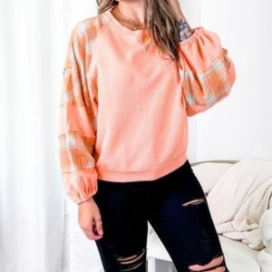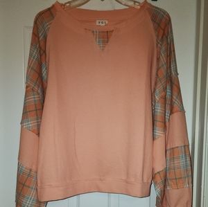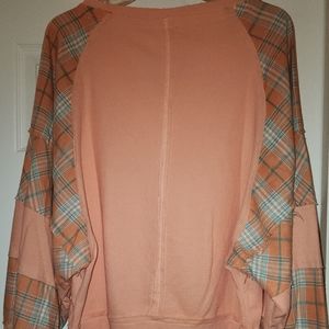 New without tags, pol waffle knit and plaid mix top. Relaxed fit. Has balloon sleeves, raw edging, size Large. measures about 22" from armpit to armpit.