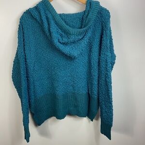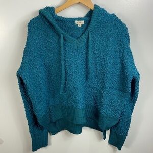 A hoodie sweater comes with knitted weaved band detail on high and low length hem.