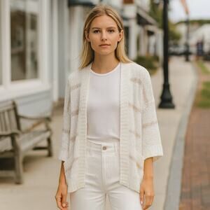 Soft and cozy, this cream knit cardigan features subtle tan and blush horizontal stripes for a relaxed, feminine look. Designed with a deep V-neckline, button front, and slightly flared sleeves, it’s perfect for layering over tees or dresses. A versatile piece for cottagecore, boho, or casual fall styles.
