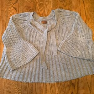 "POL" sweater, size medium - large, with tie neck. Loose fit. Bell sleeves. Color: taupe. Fabric: 100% polyester. Measurements (approximate): chest(flat)= 24", inside sleeve. seam (including 6.5 'bell')13", front length (from bottom of 'V' of neck to bottom)=16", back length (mid collar to bottom). Thanks for looking!