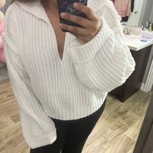 White thick stitching seater with a low v neckline, chunky, bell sleeves