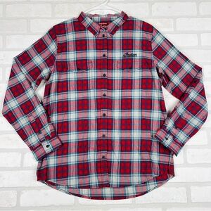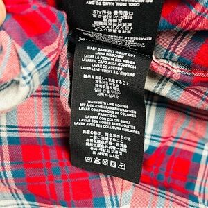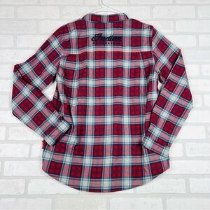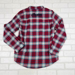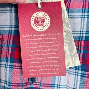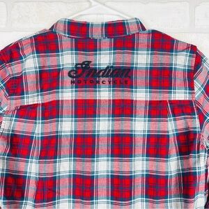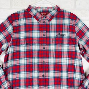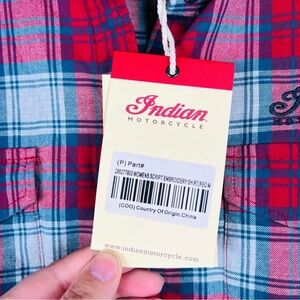 POLARIS INDIAN MOTORCYCLES WOMENS RED SCRIPT EMB SHIRT SIZE MEDIUM NWT. Elevate your style with the red plaid men's shirt. Perfect for casual outings, this shirt combines comfort and classic design. 100% brushed cotton for comfort. Large embroidered Indian Motorcycle script logo on the back. Small embroidered script logo on the front. Rollable sleeves help you stay cool in warmer weather. Two chest pockets with buttons. 20.5” chest, 28” length. #921 8.2