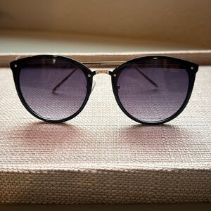 STYLE: Polarized UV protection sunglasses, gold and dark/blue grey lenses, have a little bit of a cat eye shape mixed with Wayfarer shape