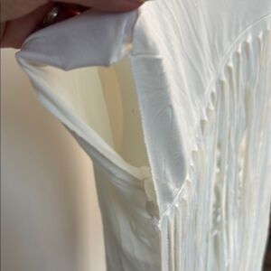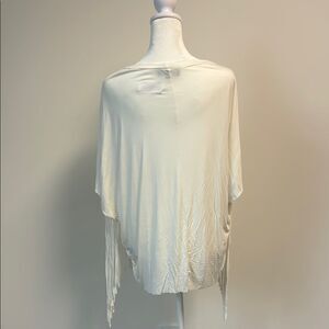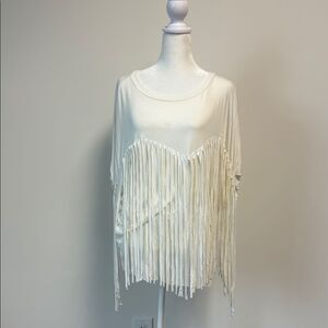 This elegant cream top features stylish fringe detailing, perfect for adding a touch of sophistication to any outfit. Ideal for both casual and formal occasions.