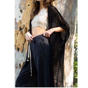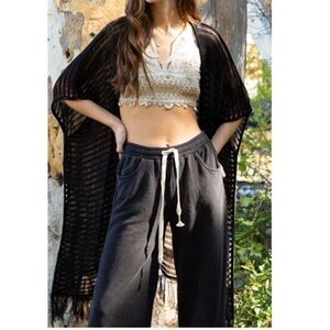 POL Fringe Cardigan. See through with loosen horizontal rib knitting features fringe hem. Loose fit style.