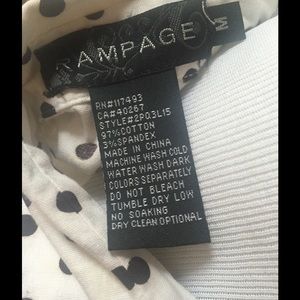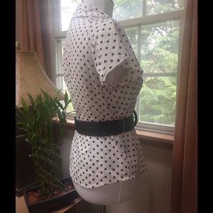Cute polka dot blouse. 97% cotton 3% spandex. Belt included but can be worn without. Belt has no actual belt holes so one size fits all....some places on belt you can tell where belt was adjusted too...see pic. Says medium kind of runs on the smaller side though.
