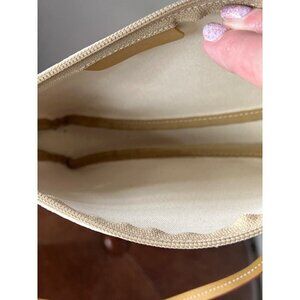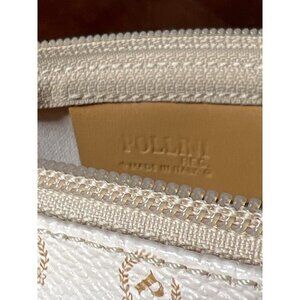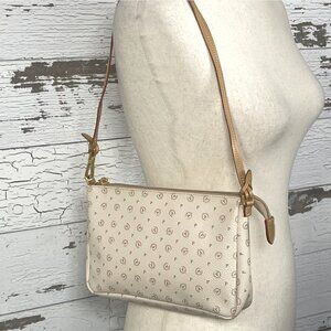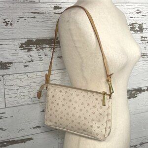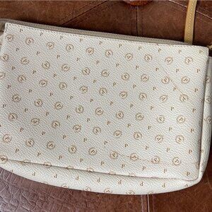 Very cute, lightweight small shoulder bag by Pollini. Cream colored monogramed leather with light brown strap; gold tone hardware. One side of strap has handy hook for keeping keys handy. No pockets inside. NOTE: There are two marks on bag. I don't know how I got them, I always meant to take it to a leather cleaner and have them dealt with, but I didn't. Please see all photos. Other than the marks I've mentioned, the bag is in pristine condition. Last 2 photos show marks up close and at a distance. Bag measures approx 9" wide, 6" tall, 2" deep. Strap drop approx 10".