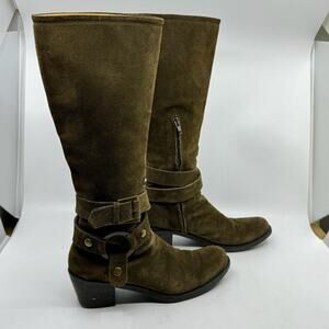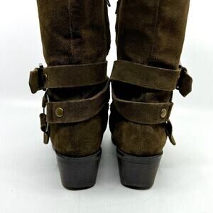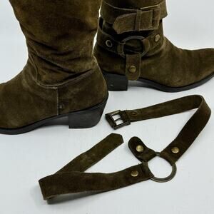 Details: Olive suede knee-high western moto boots with removable belted buckle ankle straps (snaps on & off) and inner ankle zipper from arch to mid-calf. This is a very cool western, country, rustic, rodeo, boho, bohemian piece!