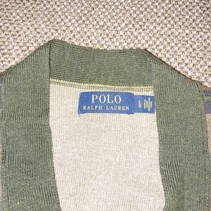 POLO, RALPH LAUREN MEN'S VARSITY P SWEATER GREEN CAMOUFLAGE ORANGE STRIPES ON SIDE ARM TWO FRONT POCKETS BUTTON UP SIZE LARGE