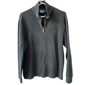 Mens size Medium, black with red signature pony, 1/4 zip with leather zipper pull, 100% ribbed knit cotton.