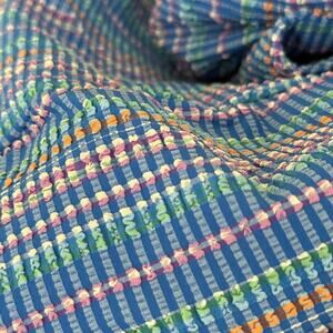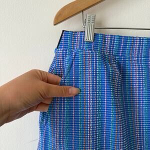 This skirt features a crinkle texture (see photo), 2 pockets on the waist and an elastic waistband. The inner front bottom strip of fabric is loose and will need to be restitched (see last photo).
