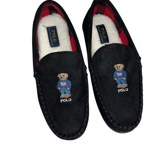 POLO RALPH LAUREN Bear Black Suede Moccasin Slipper Sherpa lined new nwot men 8