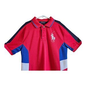 POLO RALPH LAUREN Boy's Size M 10-12 Polo Shirt - 1/4 Snaps, Red, White, Blue, Short sleeve, Large Pony Logo, Slide Slits, 96% Polyester, 4% Elastane