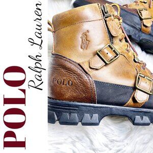 Rugged, heavyweight Polo Ralph Lauren Padded Ankle Leather Demond Duck Boot. Boots feature a duck style toe, padded ankles, dual buckles on outer side, double-sided zippers, lace up front and chunky, treaded lug sole.