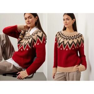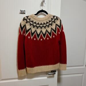 Multicolor abstract knit (45% wool, 30% acrylic, 25% alpaca wool). Sweater. Long sleeves. Crewneck. Pull on. 25" from shoulder to hemline.