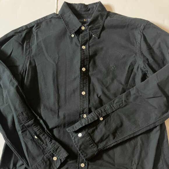 Polo Ralph Lauren Men's Button Down Long Sleeve Shirt. Size Large. Color is Black. 100% Cotton. Horseman is also Black. Good Shape (this shirt was always taken to Dry Cleaners to preserve color).