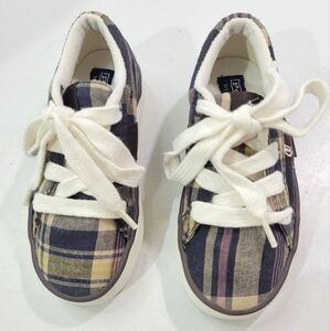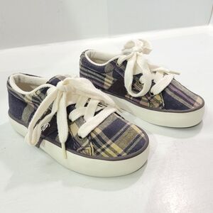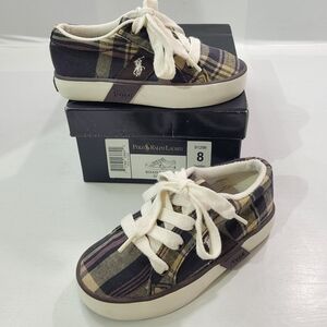 POLO RALPH LAUREN ROAD MULTI GILES TODDLER CASUAL SNEAKER SHOES MADRAS PLAID FABRIC SIZE 8 NAVY/TAN W/BOX. PRE-OWNED-GOOD CONDITION-SEE PICS