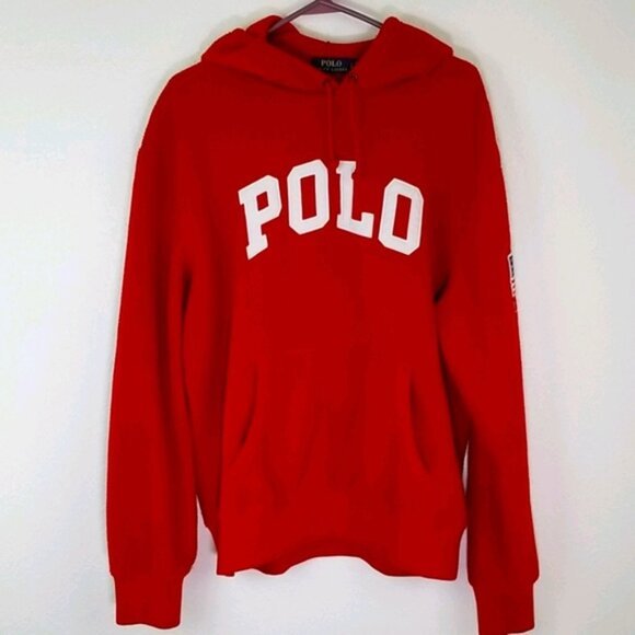 POLO RALPH LAUREN Red Hoodie, size L. The hoodie is red with the USA Flag embroidered on the left arm along with U.S.A. It is 100% polyester although the outer material looks like fleece. Gently pre-owned.