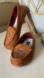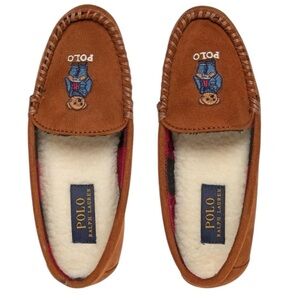 Comfortable brown suede slippers with a cozy Ivory Sherpa footbed and bright plaid interior. Featuring Ralph Lauren branding. NWOT Store try-on only
