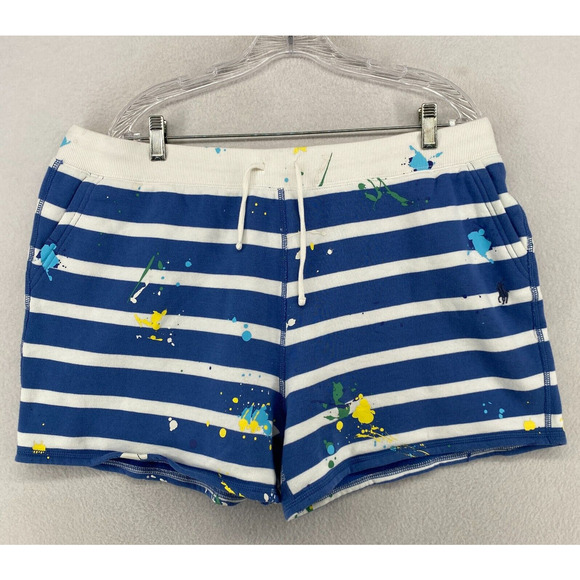 POLO RALPH LAUREN Shorts Womens XL Paint Splatter Striped Fleece 4" Sweat Blue