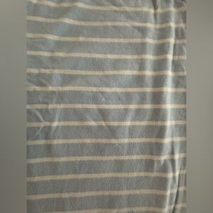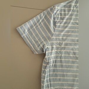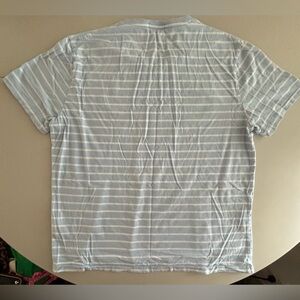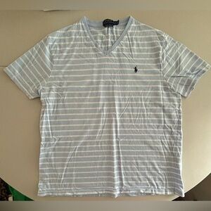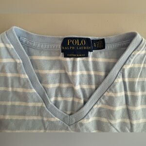 Men’s Polo Ralph Lauren Custom Slim Fit, pull over, V-neck t-shirt. Short sleeves. Horizontal white stripes. Traditional embroidered Polo player on left chest. Good used condition.