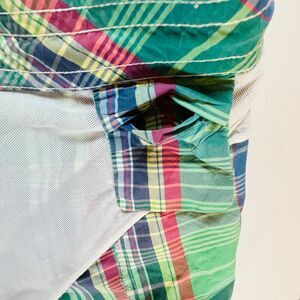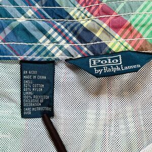 For sale are these POLO Ralph Lauren Mens Board Shorts, size XXL. Green/blue plaid cotton/nylon blend with white polyester mesh lining. Lots of pockets. Zipper and button closer with inside drawstring.