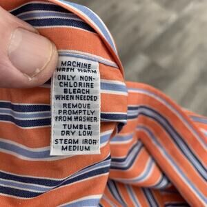 This POLO Ralph Lauren Men's Large Orange Stripe Westerton shirt is made of 100% 2-ply cotton, making it a high-quality and comfortable option for casual wear. The button-up style, collared neckline, and long sleeves give it a classic and polished look, perfect for all seasons. The orange stripes add a pop of color to the shirt, making it a versatile and stylish piece for any man's wardrobe. Easy to care for with machine washable fabric, this shirt is a timeless and breathable option for everyday wear.