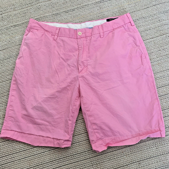 The product is a pair of men's Polo Ralph Lauren shorts in a bright pink color. Made from a classic cotton blend fabric, these golf-inspired shorts feature a solid pattern, zip closure, and flat front design. With a 9-inch inseam and waist size of 34 inches, these lightweight and machine washable shorts are perfect for casual or travel occasions. The shorts also come with button and logo accents, as well as a slash pocket design, showcasing the designer brand's signature style and outdoor theme.