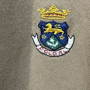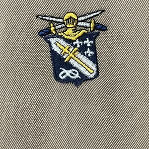 The product is a pair of Polo Ralph Lauren men's The Polo Chino pants in size 44x30, made of classic cotton twill fabric with multiple embroidered family crest emblems and logo. These classic cotton twill chino-style pants feature a solid brown color, a straight leg design, belt loops, and a high-rise fit. They have a flat front, interior zipper button closure, and multiple pockets including a front key pocket and back pockets. Perfect for travel, casual, or business occasions, these machine washable pants are designed for comfort and style, making them a versatile addition to any wardrobe. The pants are marked 40/32, actual measurements are 44/30. Pre-loved in great condition. Please view all photos. Thanks for looking!