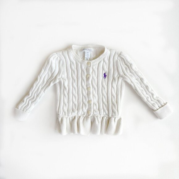 POLO Ralph Lauren toddler cream knit cardigan with purple POLO logo and button front closure. Peplum ruffled bottom.